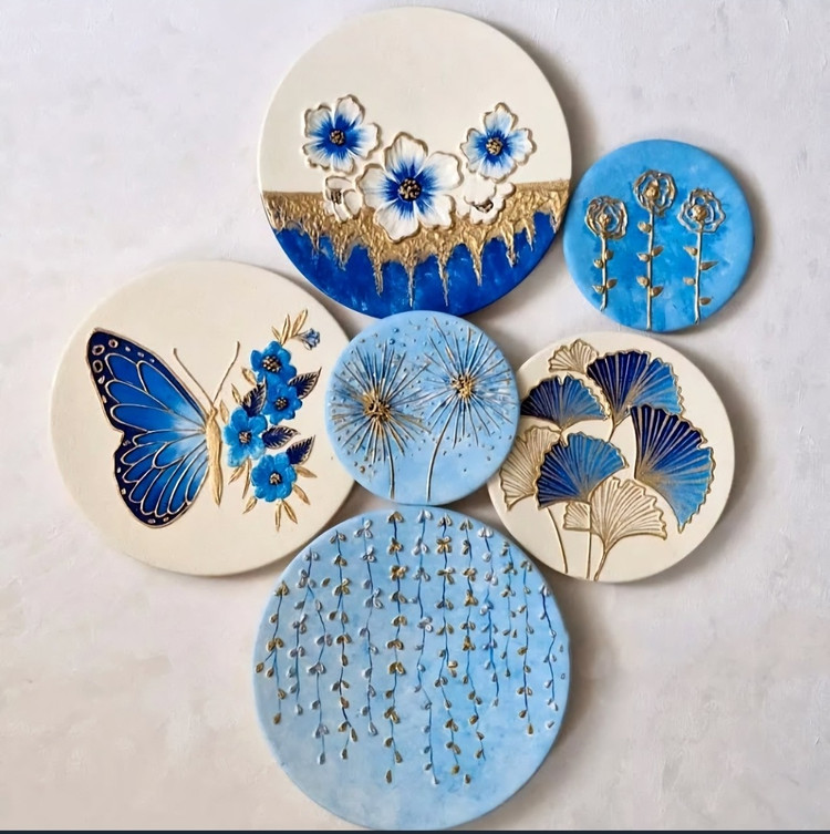 ست دیوار کوب آبی اسمانی وکرم برجسته طرح پروانه ورق طلا گل