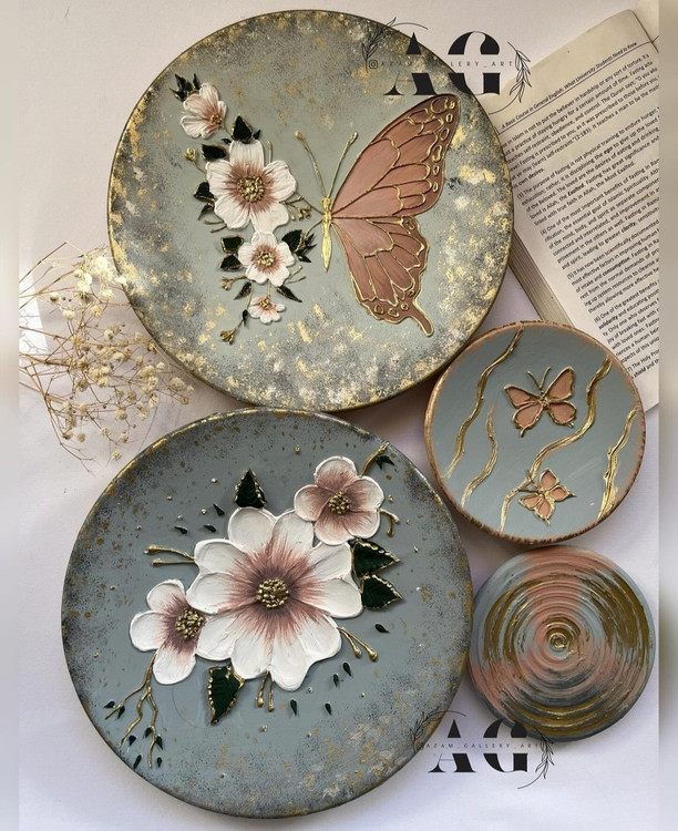 ست دیوار کوب پتینه برجسته زمینه توسی سبز طرح گل پروانه ورق طلا