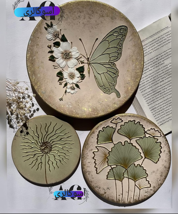 ست دیوار کوب سبز کرم برجسته طرح گل وپروانه ورق طلا
